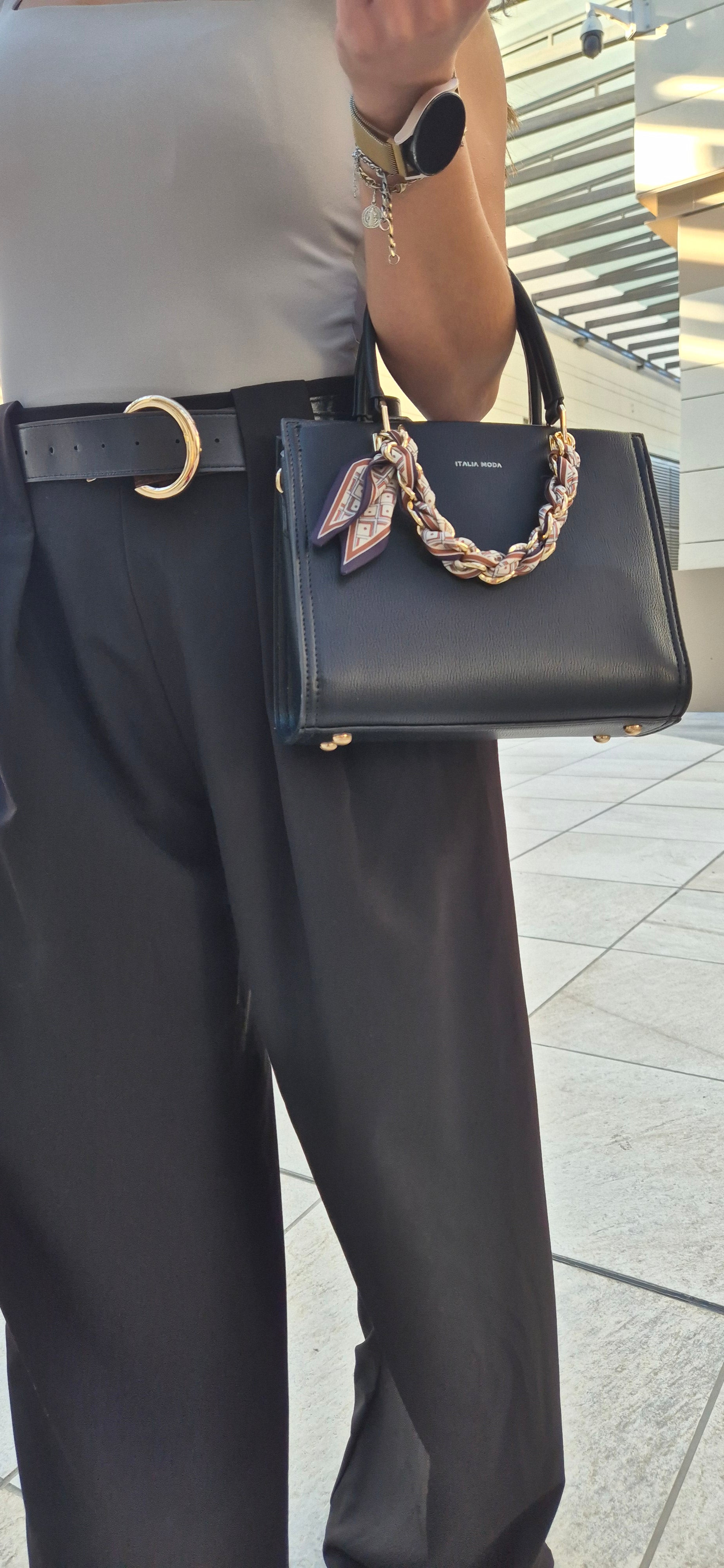 Un diseño que refleja sofisticación absoluta. Este bolso estructurado en tono Negro profundo es la definición de elegancia atemporal. Su silueta firme y líneas limpias estilizan cualquier look, mientras que los detalles dorados aportan un brillo sutil y exclusivo que capta miradas sin esfuerzo.