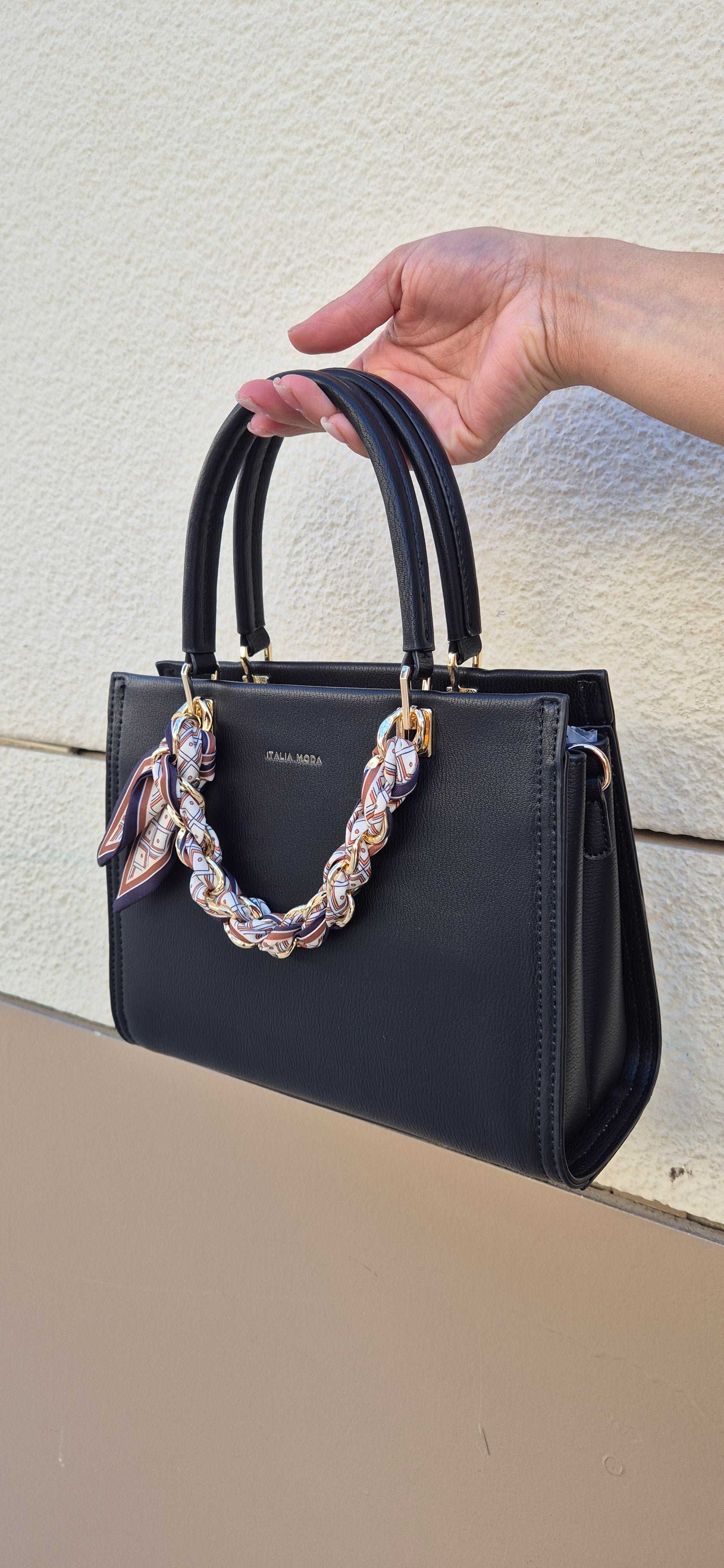 El asa superior se realza con una cadena decorativa envuelta en un delicado pañuelo estampado. Su tamaño ideal permite llevar lo esencial con estilo, convirtiéndolo en el complemento perfecto tanto para el día como para la noche.