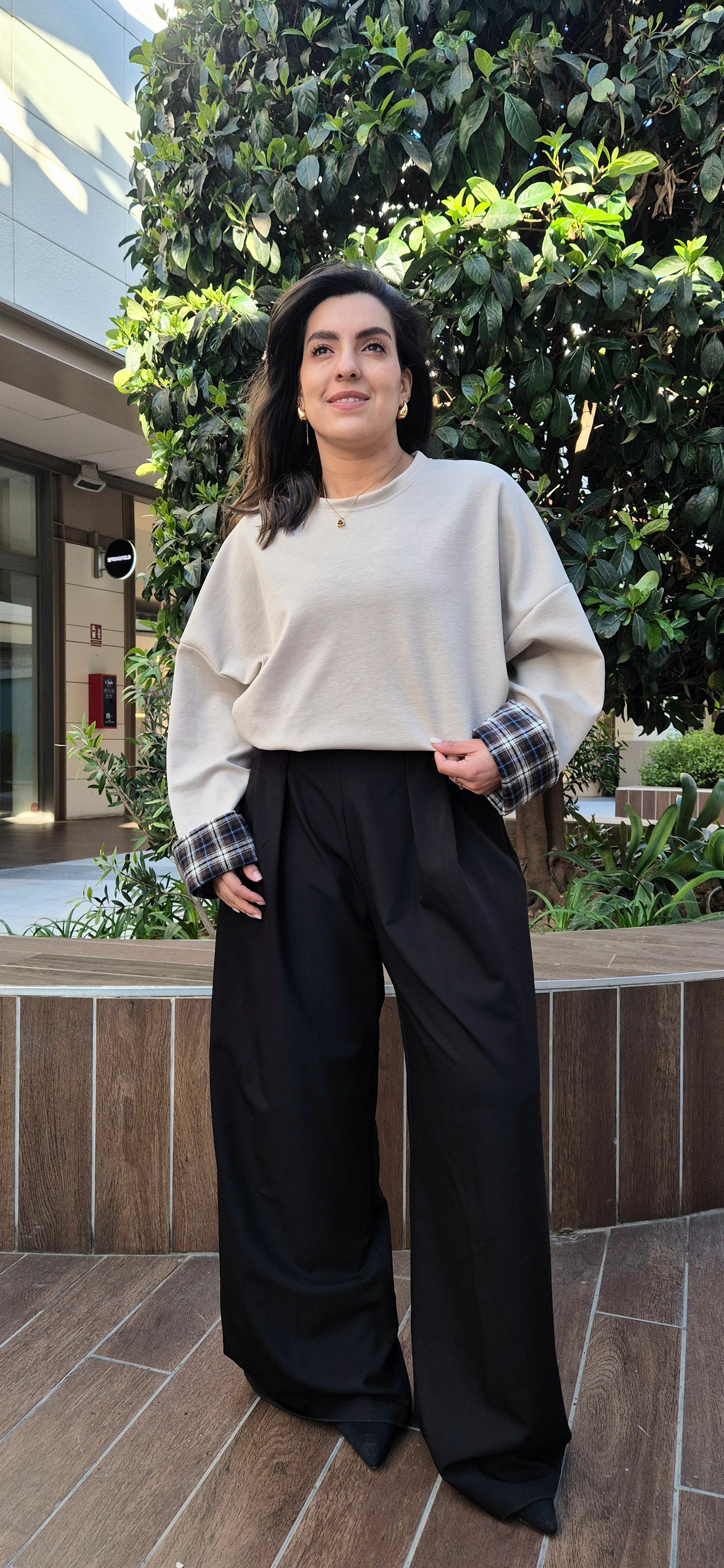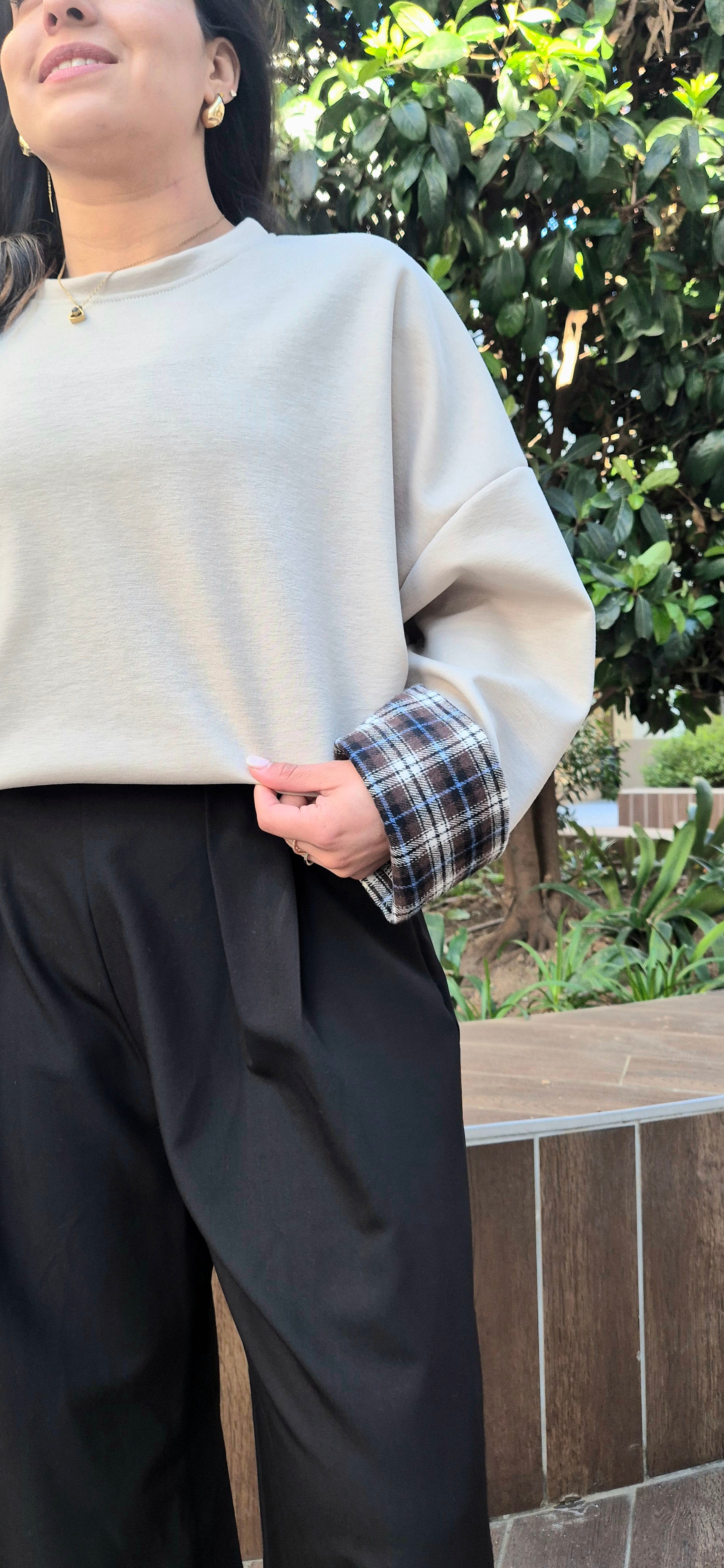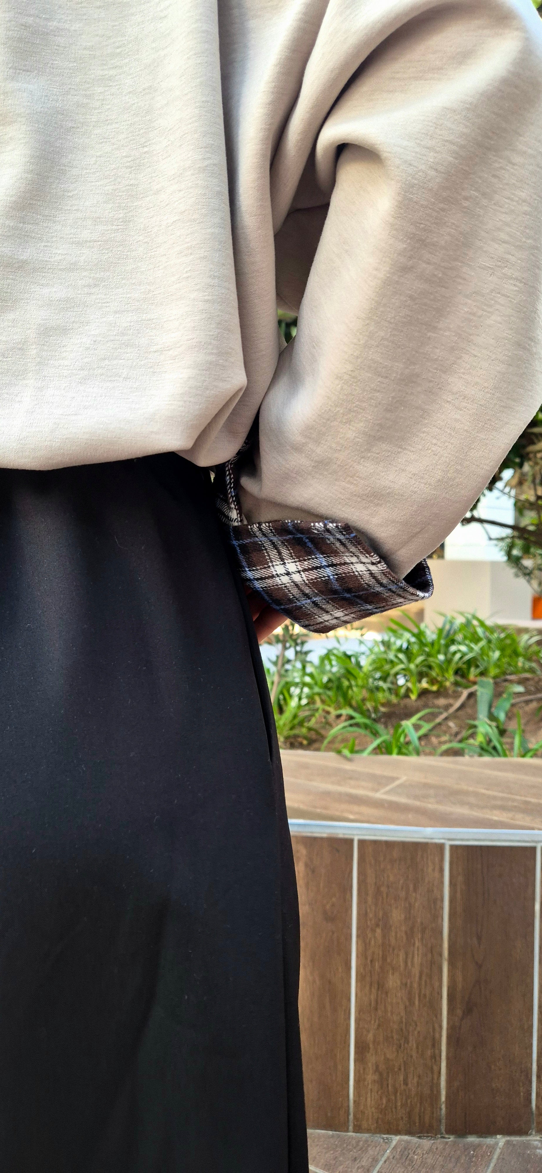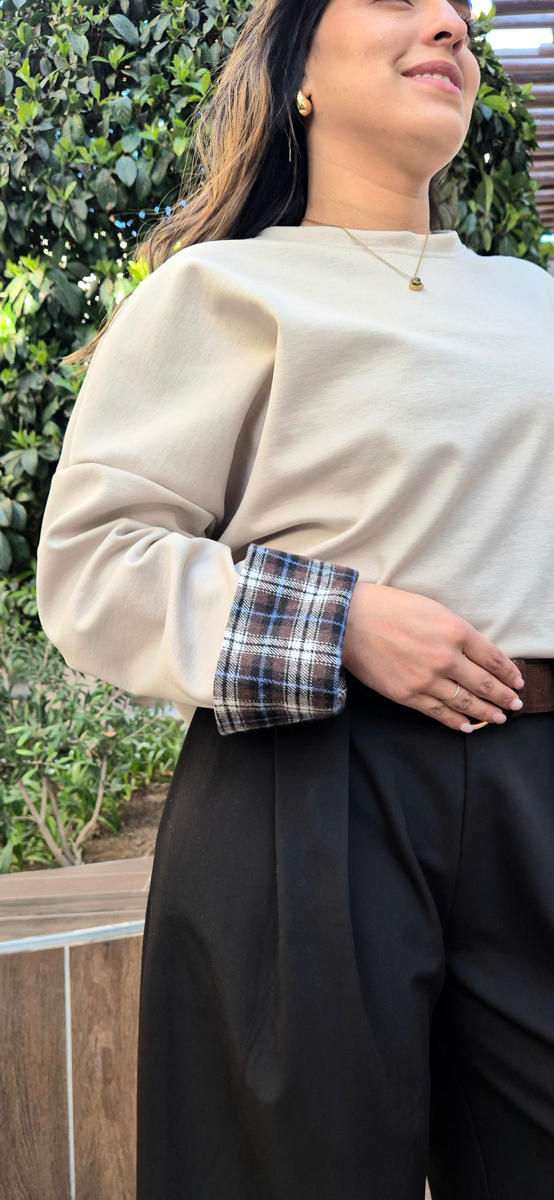 Jersey color Moca de diseño minimalista y corte moderno, con mangas amplias y detalles de puño en contraste que aportan un toque sofisticado. Una prenda elegante y versátil, ideal para elevar tus looks diarios con estilo y personalidad.